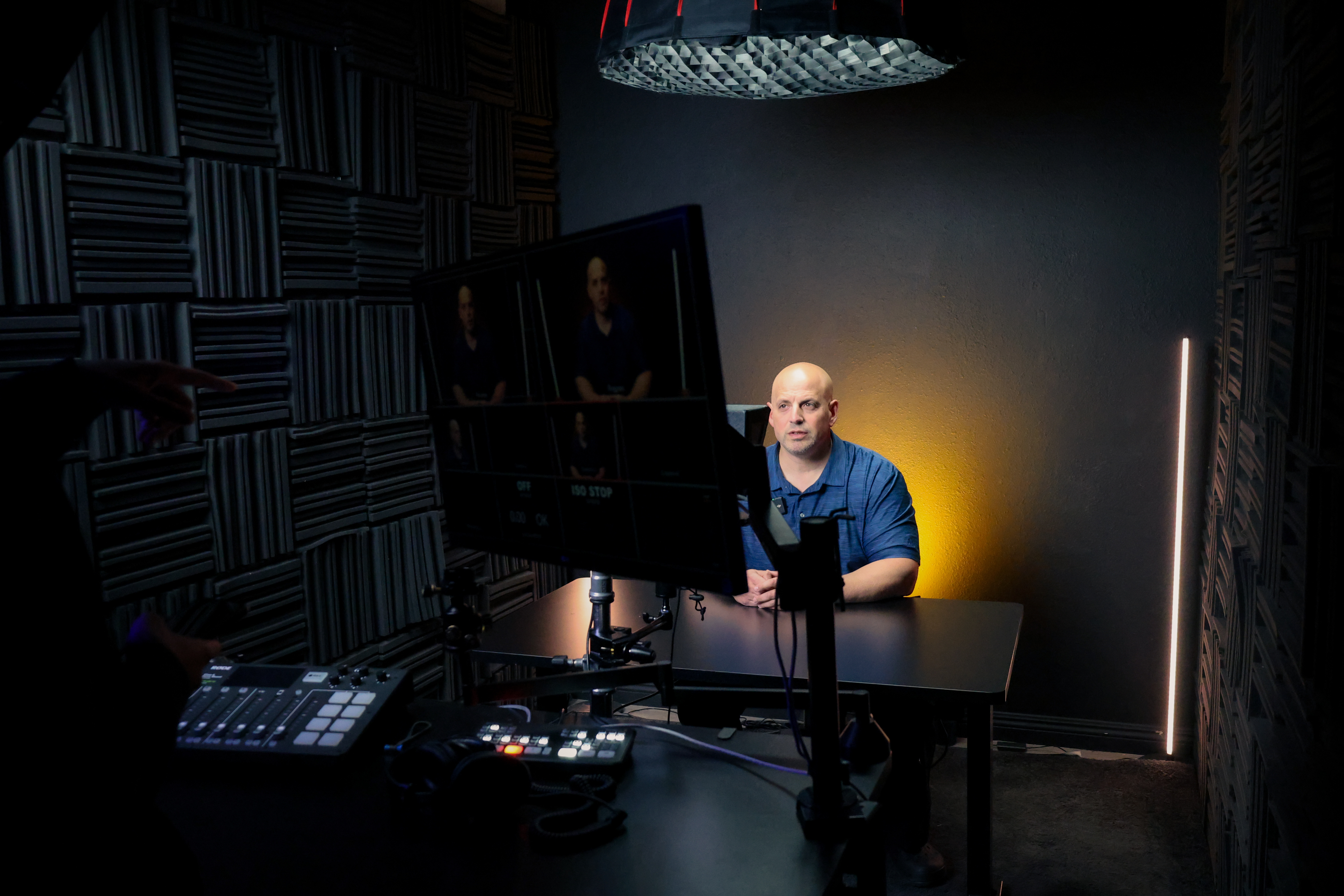 Dark tones and brick accents create a focused environment ideal for teleprompter work, sales messaging, and high-volume content days.