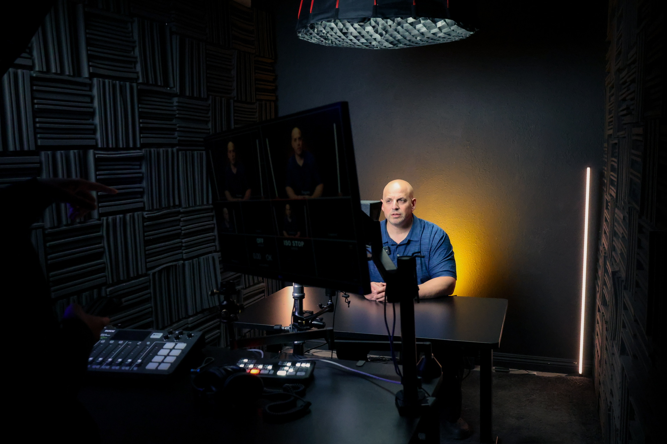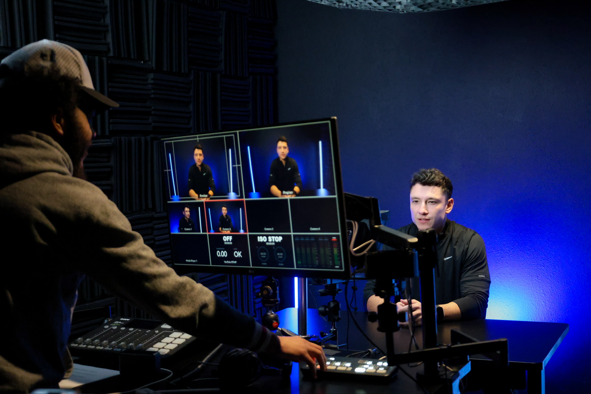 A dark, controlled studio built for creators who want a clean, cinematic look. Ideal for solo shoots, ads, promos, YouTube, and corporate video with the flexibility to support a two-person podcast setup when needed.