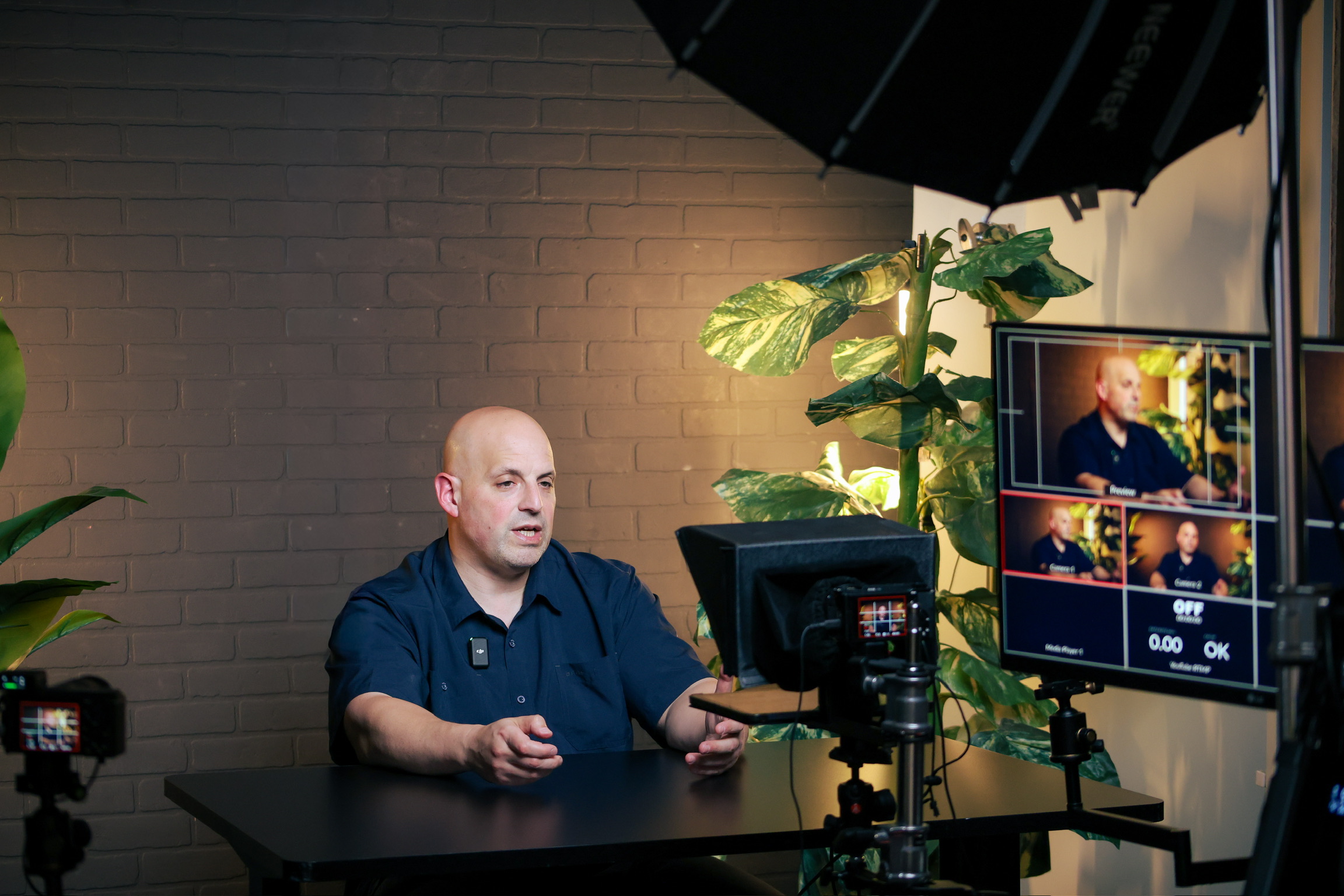 Dark tones, brick backdrops, and a focused setup make it ideal for teleprompter work, direct-to-camera delivery, and high-volume content days.